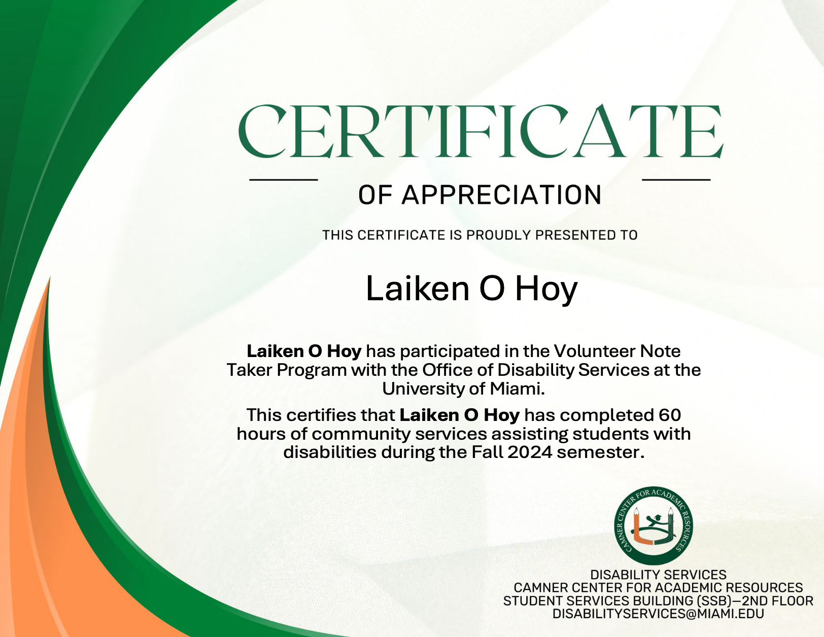 As a volunteer note taker, I provided detailed class notes to support students with disabilities, ensuring equal access to course materials and academic success. Through this role, I completed over 60 hours of community service during the Fall 2024 semester, strengthening my sense of responsibility, inclusivity, and attention to detail.